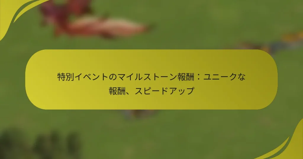 特別イベントのマイルストーン賞は、プレイヤーが期間限定のイベント中に特定の目標を達成することを促すために設計されたエキサイティングな報酬です。これらのイベントに参加することで、プレイヤーはゲームプレイ体験や進行を向上させるユニークなアイテムやスピードアップを獲得できます。これらのイベントは、季節のテーマや祝日と連動することが多く、ゲームを楽しむためのダイナミックで魅力的な方法を提供します。 特別イベントのマイルストーン賞とは? 特別イベントのマイルストーン賞は、プレイヤーが期間限定のイベント中に特定の目標を達成することで与えられる報酬です。これらの賞はプレイヤーを動機づけ、ゲームプレイを向上させ、体験に大きな影響を与えるユニークなアイテムや特典を提供します。 マイルストーン賞の定義と目的 マイルストーン賞は、特別イベント中にあらかじめ定められた目標を達成することでプレイヤーが得る報酬です。これらの目標は、タスクの完了から特定の期間内にポイントを蓄積することまで多岐にわたります。これらの賞の主な目的は、イベントへの参加と関与を促すことです。 マイルストーン賞を提供することで、ゲーム開発者は達成感と進行感を生み出すことを目指しています。プレイヤーはより積極的に参加することを奨励され、これが長時間のプレイセッションやゲームコミュニティとのインタラクションの増加につながる可能性があります。 特別イベントにおけるユニークな報酬の例 ユニークな報酬は多くの形を取り、ゲームプレイ体験を向上させ、プレイヤーに他では得られないアイテムを提供します。例としては: イベントテーマを示す独占的なスキンやキャラクター衣装。 特別な通貨やクラフト素材などの期間限定リソース。 ゲームプレイボーナスを提供するユニークなペットや仲間。 イベント中のみ利用可能な特別な能力やパワーアップ。 これらの報酬はプレイヤーの体験に価値を加えるだけでなく、イベントが終了する前に参加する緊急性を生み出します。 イベント中に利用可能なスピードアップの種類 スピードアップは、プレイヤーが建設やユニット訓練など、さまざまなゲーム内プロセスを迅速化するための重要なツールです。特別イベント中、プレイヤーはしばしば以下のような異なる種類のスピードアップにアクセスできます: タスクを即座に完了させるスピードアップ。 進行中のタスクの所要時間を短縮するスピードアップ。 ゲーム内通貨を必要とするリソースベースのスピードアップ。 これらのスピードアップは、プレイヤーがより早く進行できるようにし、特に時間制限のあるイベント中に非常に価値があります。 ゲームプレイにおけるマイルストーン賞の重要性